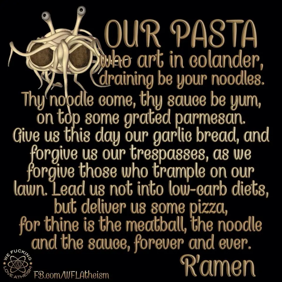 "For thine is the meatball, the noodle and the sauce, forever and ever. R'amen"
