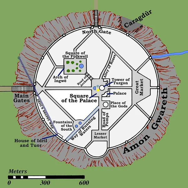 Finally, the above here shows a coloured version of Karen Wynn-Forsted's Atlas of Middle Earth. It shows the structure of Gondolin internally.